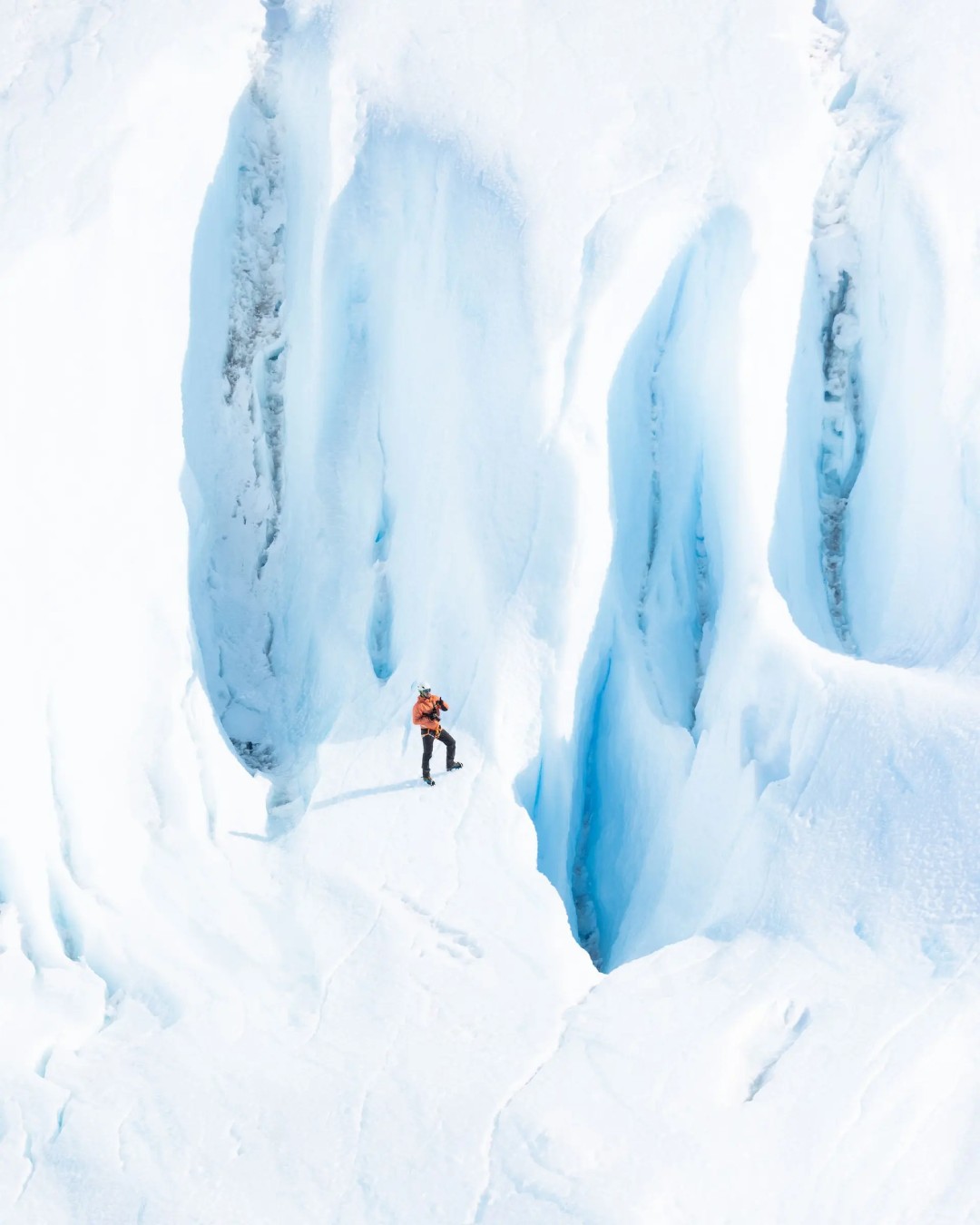 Reaching them is an adventure in its own right. As much as the destination is the point, the journey builds the anticipation: a two-hour hike across undulating, sweeping icefields, where the horizon glows white in every direction. You descend into a quiet valley, then climb toward the tunnel entrance, a contrast so striking that the moment the blue reveals itself feels almost cinematic.